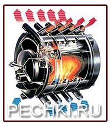 Отопительная печь БРЕНЕРАН - гениальное техническое изобретение, экономящее деньги и энергию. Иначе, чем другие нагреватели, отдающие тепло только с внешней поверхности, печи БРЕНЕРАН с самого начала сконструирован как настоящий нагреватель воздуха. Цельнометаллическая конструкция с вваренными в нее многочисленными трубами обеспечивает принудительную конвекцию, благодаря чему происходит быстрое нагревание воздуха и его плавное распределение по всему объему помещения. Работает простой физический принцип - теплый воздух поднимается наверх, а более холодный постоянно всасывается с пола. Каждая из труб печи БРЕНЕРАН, полностью прикасаясь к топке, успевает нагреть проходящий через нее воздушный поток до 60 '- 150'C. Самая маленькая печь БРЕНЕРАН пропускает через себя 4,5 куб.м воздуха в минуту. В то же время температура самой печки остается достаточно низкой, она не раскаляется как "буржуйка".